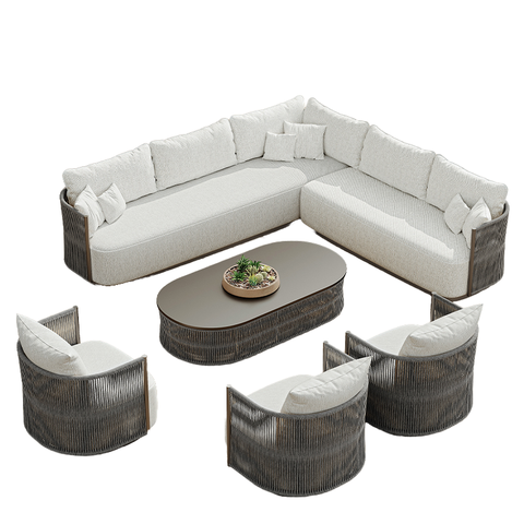 Modern dış mekan mobilyaları Bohemian Sunproof hasır bahçe kanepe seti Metal kirpik ahşap halat Rattan ile otel ve parklar için